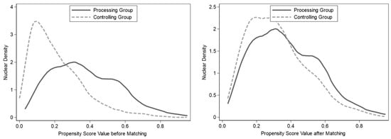 Table 3 shows that the sample data after matching is 2666. The kernel density curves before and after matching are plotted as follows:
