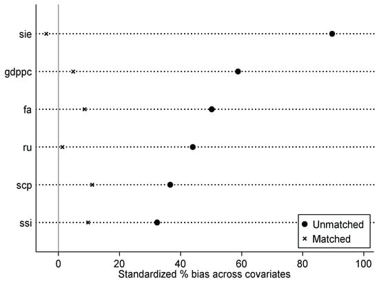 As illustrated in Figure 3, all absolute values fall below the threshold of 10%, and the balance test p-values for the matched control variables exceed 5%, failing to dismiss the null hypothesis. This outcome signifies that our sample meets the criteria for equilibrium in the balance test. Consequently, the matching approach deployed in this study is found to be justifiable, rendering the post-matching results more harmonious across the data and circumventing potential endogenous problem attributable to selection biases.