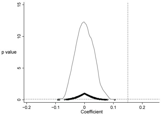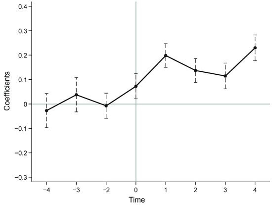 In considering the regression coefficients in Table 5, we see that columns 3 and 5, which take into account the control variables, have smaller regression coefficients than regression coefficients that do not take the control variables into account. This substantiates the stability of the outcomes obtained from the measurement. In a side-by-side comparison, the partial regression coefficients of the core explanatory variables in the PSM-DID model regression are significantly smaller than those of the OLS regression results, which indicates that the OLS method is unable to strip out the net gain of the LCPP itself in improving urban green innovation efficiency, and also demonstrates the necessity and reasonableness of the use of the PSM-DID model. In referring to the PSM-DID model regression results that add the controlling variables, we see that when other conditions remain unchanged, every ten thousand CNY increase in GDP per capita will correspond to a 15.08% increase of the urban green innovation efficiency, on average; for every 1000 increase in the size of the research workforce, the level of urban green innovation efficiency will increase by 16.88% on average, with both being found to be valid at the 1% level of significance. Therefore, compared with other controlling variables, GDP per capita and size of the research workforce are undoubtedly the controlling variables that can most significantly promote urban green innovation efficiency. In addition, the study reveals that industrial structure and urbanization level both significantly impact urban green technological innovation. At the 1% significance level, a 1% increase in the output share of the secondary industry leads to a 1.75% boost in urban green innovation efficiency. Similarly, a 1% rise in urbanization rate corresponds to a 3.43% increase in green innovation efficiency at the 5% significance level. Nonetheless, it is crucial to acknowledge that the influence of both factors is significantly weaker than the influence of GDP per capita and research workforce size. The partial regression coefficient of high-tech enterprises is negative but not significant. The partial regression coefficient of financing facilitation shows 0.0008 at the 10% significance level, indicating that while it makes some positive contributions to the urban green innovation efficiency, the effect is relatively weak.