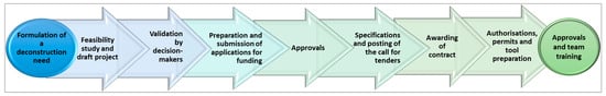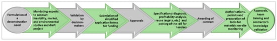 The process begins with the formulation of a deconstruction need by the clients and ends with providing training for the contractor and teams. Once the deconstruction need is communicated, the GM of the RITMRG carries out a feasibility study and draws up a project implementation request. The document is submitted to the clients for approval. The GM of the RITMRG then submits an application for funding. In the next step, she draws up the specifications and clauses and issues a call for tenders to select the contractor who will carry out the work. Once the contractor is selected and confirmed by the clients, the contract is awarded and the contractor applies for the necessary authorisations and permits (telephone service provider, electricity supplier, government departments, etc.). She then prepares monitoring tools (for work and material flows) and training for the contractor and teams (e.g., related to the types of materials, their destinations, elements that favour reuse, etc.).