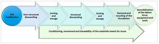 As an example of changes in the pre-deconstruction phase, it is proposed, after the formulation of a deconstruction need by the clients, to mandate experts to conduct studies on the project feasibility, the market of reused materials, and environmental aspects to collect all the data needed to better estimate the project cost and profitability, potential markets and destinations for materials meant for reuse, labour skills required, etc. Regarding the deconstruction phase, once the preparation of the site is complete, it is recommended that, first, experienced workers retrieve contaminated materials and store them in dedicated containers. After that, the site should be developed in order to facilitate the effective storage of materials and their smooth movement on site. In post-deconstruction, it is recommended to start with the visual inspection of the materials and to continue sorting and storing the materials according to their destinations (reuse, recycling, landfill).