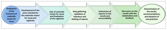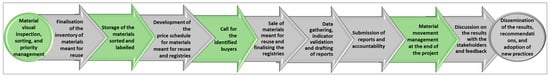 The process begins with the finalisation of the inventory of the materials meant for reuse and ends with the adaptation of new practices and the dissemination of results to all stakeholders. The GM of the RITMRG prepares the price schedule and announces the start and duration of the sale (social media, radio, posters, partner websites, etc.). The materials are then sold, and the GM of the RITMRG completes the buyers’ registry. When the sale ends, she proceeds with the accounting and presents various reports to the project clients and funding agency. The findings and recommendations arising from the project are documented with a view to potentially adopt new practices. Finally, the project results are shared with the stakeholders.