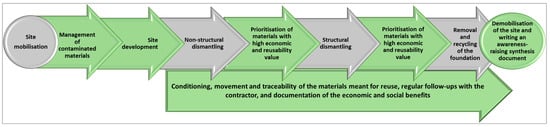 Table 4 shows how important the inspection stage is in the literature. Indeed, it is a significant, even critical, step in the deconstruction process. There are also steps that must be taken before the project is drafted, such as assessing the building, carrying out an environmental assessment, and mandating an expert to conduct a reuse market study. After selecting the contractor, the next important step is drafting the work plans (that should be conducted by the contractor). These plans provide the contractor with an overall view of the site and prevent any unforeseen events.