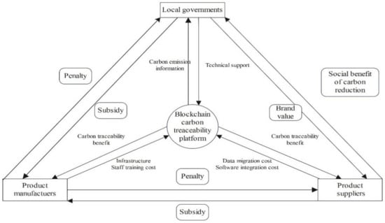 Local governments. To ensure blockchain-based traceability systems operate smoothly, the LGs should work with low-carbon supply chain participants. [44]. For instance, the LGs will have mainly policy and regulatory functions. The LGs will also provide subsidies and other penalties to change the behavior of PSs and promote low-carbon supply chains [54]. As blockchain is a new technology, the government needs to be able to build new organizational forms that correspond to it and guide relevant actors to apply blockchain to achieve more responsible forms of trust [55].
