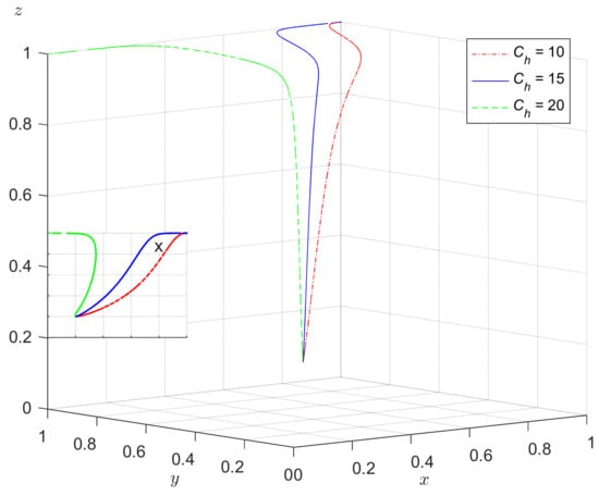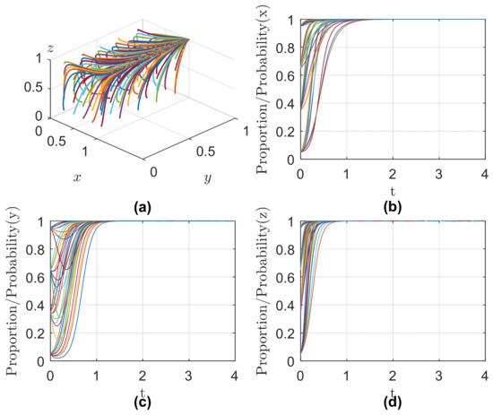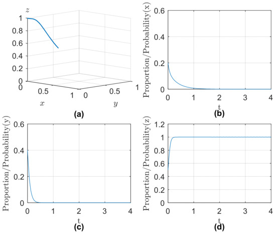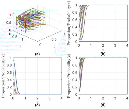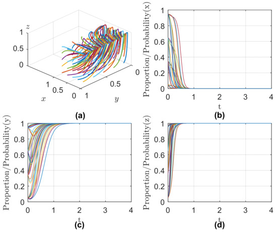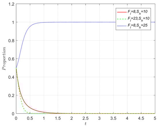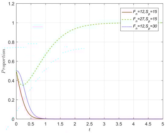 When , . From Equation (13), the equilibrium points of the system can be given: , , , , , , and . Morever, mixed-strategy equilibrium points can be given as follows: