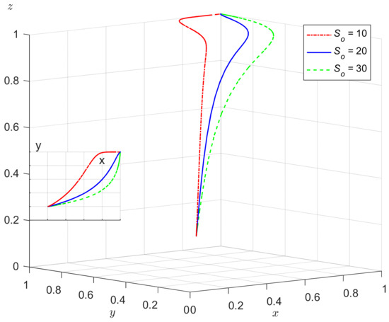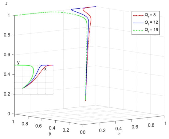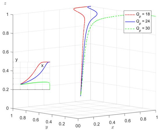 The asymptotically stable condition is satisfied at (0, 1, 1), that is and . All of the eigenvalues (, and ) are less than zero to the equilibrium points (0, 1, 1). As the iteration process proceeds, the simulation results (Figure 4) indicate that the probability/proportion of the PSs choosing the traceability strategy and the probability/proportion of the LGs strictly regulating increases, while the probability/proportion of the PMs choosing traceability strategy decreases. After the introduction of the blockchain technology traceability system into the supply chain, the stable evolution strategy of the PMs, the PSs, and the LGs is {not traceability, traceability, and strict regulation}. For the first inequality , it can be found that, under the premise of strict the LGs regulation and supplier “traceability” strategy, the total return of the manufacturer’s hitch-hiking strategy is higher than the total return of the “traceability“ strategy, so the manufacturer chooses the “no-traceability“ strategy. The second inequality also shows that the total yield of the PSs after adopting “traceability” exceeds the benefits after no-traceability minus punishment, so the supplier chooses the “traceability” strategy. Figure 4 shows the evolution trajectory.