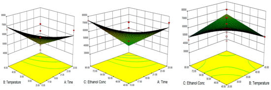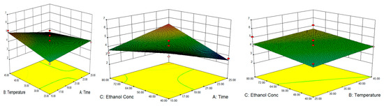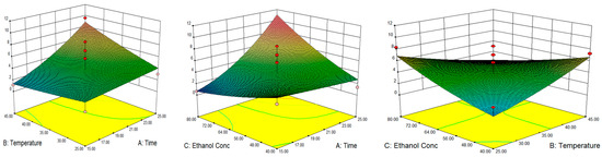 The three-dimensional response surface plots utilized in this study are shown in Figure 1, Figure 2 and Figure 3. It can be noticed that as the temperature increases, TPC production increased, which was parallel with a previous study [15]. As per the surface plot, the percentage of water in ethanol (from 60% to 80% v/v) was noticed to be a major determinant in phenolic component extraction, with extracts being recovered less when the solvent level was larger than 60% (v/v). The TPC results matched with the previous study of Insang et al. [19] which found that bioactive compounds (such as TPC) extracted from mulberry leaf using ultrasonic extraction were at their greatest concentration at 60% v/v ethanol [19]. Tungmunnithum et al. [24] also confirmed that the optimal condition for ultrasound-assisted extraction of total phenolic compound from almond oil residues was at 53.0% (v/v) ethanol, as green solvent solutions with water. These two studies suggest that UAE extraction with 50–60% ethanol could be capable of penetrating cells to dissolve phenolic compounds, as compared to a higher ethanol concentration, which can cause protein denaturation and decrease the rate of dissolution of phenolic compounds.
