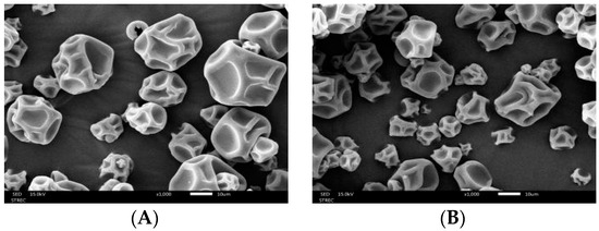 SEM analysis of microcapsules prepared with different formulations of GA and MD: (A) GMM 1 and (B) GMM 2.