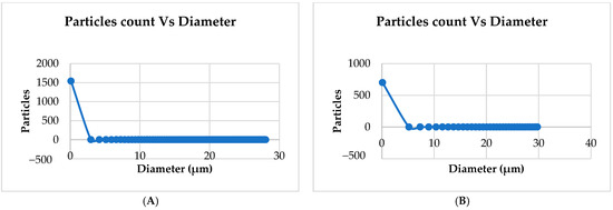 The optimum microcapsules are spherical in shape, have a smooth and uniform surface, and lack wrinkles or dents. It has been identified that the microcapsules (GMM 1 and GMM 2) have a spherical shape (Figure 4). A similar observation was mentioned in a study by Akram et al. [33] where GA, MD, or a mixture of them was used to prepare spray-dried microcapsules of polyunsaturated oils by oil-in-water emulsions, and both microcapsules were found to have crystalline structures and a spherical form with surface shrinkage. Generally, microcapsules become dented by the pressure of steam created on the interior structure during spray drying which causes shrinking of the microcapsules due to moisture loss. The extract/GA + MD ratio utilized in this investigation produced an appropriate encapsulation layer, which in turn produced a smoother surface and shape for the microcapsules. The two different microcapsules (GMM 1 and GMM 2) were compared, and it was seen that the microcapsules of GMM 2 at 1000× were slightly bigger in size and compactly packed as compared to the microcapsules of GMM 1 at the same magnification. GMM 2 microcapsules were attached to one another due to the high amount of GA used in the encapsulation. The most important aspect of microcapsules that affect their appearance is particle size. GMM 1 had particle sizes ranging from 2.95 ± 0.02 to 27.73 ± 0.38 µm obtained at 1000× magnification (Figure 5). Similarly, GMM 2 had particle sizes ranging from 5.20 ± 0.014 to 29.30 ± 0.42 µm obtained at same magnification. The variation in particle size may be due to an increase in inlet temperature and change in formulation of MD and high feed viscosity of emulsion formulation [34]. There were not any significant changes (p > 0.05) noticed in the particle size distribution of microcapsules in the recent investigation. The combination of highly viscous MD with low viscosity GA resulted in the formation of particles of different sizes which was the case for GMM in this study. This result was also supported by San, Jaturanpinyo, & Limwikrant [35]: when compared to formulations that combined low viscosity GA with highly viscous MD, the combination of these two polymers resulted in increased emulsion viscosity.