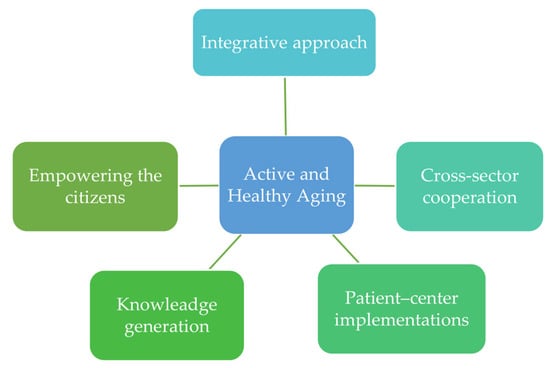 The European Innovation Partnership on Active and Healthy Ageing agency launched in 2011, and created a cooperation platform for people involved in innovation for aging well, proposing three cross-cutting and six specific action areas (Figure 1) [25]. The network provides policies on aging and care, community care, social services management and quality, inclusive activation, innovation, and digitalization [25].
