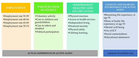 Component of active aging index (AAI). Adapted after Active Ageing Index project. https://statswiki.unece.org/display/AAI/Active+Ageing+Index+Home (accessed on 7 July 2023).