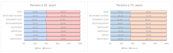 According to national statistical data, on 1 December 2021, Romania had a population of 19,053,815 persons [64], 29% in Macroregion 2 and 27% in Macroregion 3. A slightly higher percentage of women (51.5% vs. 48.5%) is observed and the difference increases to 20% for the population aged above 64 years and 29.1% for the population older than 74 years. The highest percentage of older citizens is in the Center development region, while the highest percentage of older women citizens is in Bucharest–Ilfov (Figure 5).