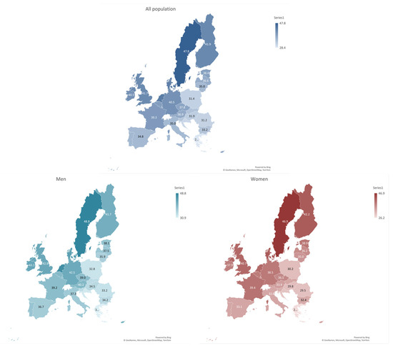 Romania had in 2020 an overall AAI of 31.2, being ranked 26/28 (employment: 31.2—15/28; participation: 13.6—22/28; independent living: 63.6—24/28; capacity: 45.9—28/28) [32], with a slightly higher value for men compared to women (Figure 6).