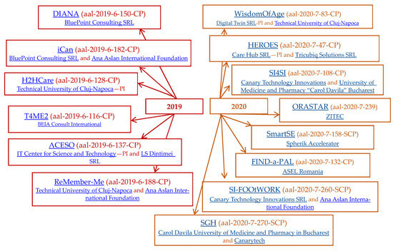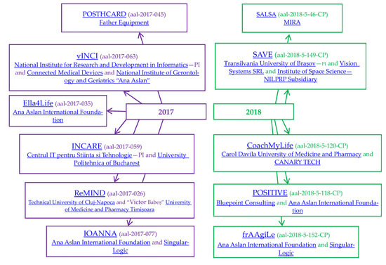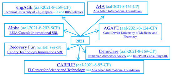 Aging Well in the Digital World (AAL Europe) [99] funds projects toward creating market-ready products and services for older people. Thirty-two collaborative projects aimed toward active aging were identified as funded from 2017 to 2021 and have at least one Romanian partner. The Romanian partners act as SMEs, R&D organizations, users, or large enterprises. The developed and implemented solutions are in the domain of assistive technology (vINCI, Ella4Life, INCARE, IOANNA, ReMIND, SAVE, CoachMyLife, Fraagile, POSITIVE, DIANA, iCAN, H2H Care, T4ME2, ACESO, ReMember-Me, A4A, Alpha) (Table 2, Figure 7, Figure 8 and Figure 9). Other domains are networking (social—SALSA, SI4SI; connection of seniors with companies or start-ups—WisdomOfAge, SMartSE), support for caregivers (recruitment—HEROES; support for persons with dementia—DemiCare), services for an active and healthy lifestyle (AGAPE and CAREUP). The topics also include a simulation platform for Alzheimer patients—POSTHCARD, therapy for dementia—SGH, training cognitive function—engAGE, measurement of lifting workloads of older workers—SI-FOOtWORK, a learning platform—FIND-a-PAL, a feasibility study associated with the CARIOT BRUSH oral-care product—ORASTAR, or personalized home rehabilitation—RecoveryFun.