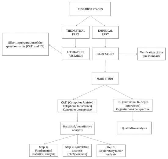 The study was conducted in 2022 using a triangulation strategy. This approach combines various methods to explore the research problem and to increase the knowledge gathered and the usefulness of the data. The research contained several stages. The research questions were initially developed based on existing knowledge and aligned with the study’s objectives. Once the questionnaires were developed, a preliminary study was conducted to validate the research questionnaires to ensure the validity of the questions. The questionnaires utilized in the study were developed by the research team based on a review of the relevant literature and expert consultation. Data collection adopted two methodological approaches: computer-assisted telephone interviews (CATIs) were used to engage customers for their views, and individual in-depth interviews (IDIs) were conducted with experts. CATIs were conducted over the phone with the help of a computer, and IDIs were one-on-one interviews conducted for detailed insights. The obtained responses were subjected to statistical analysis (Figure 1).
