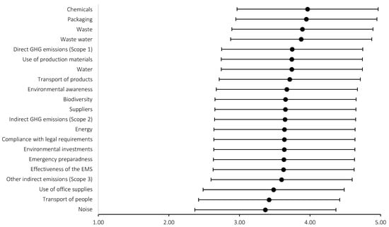In the context of environmental indicators that significantly influence purchasing decisions, the Materials and Wastes component ( = 3.89) was clearly more important than the Sustainable Management component ( = 3.46). Respondents ranked indicators related to the operational activities of the organizations higher than indicators related to the management activities of the organizations. This may be due to several underlying factors. First of all, operational activities are often more tangible and visible to the public compared to management activities. Operational activities directly influence an organization’s day-to-day environmental performance. Actions such as waste management directly affect the environment and are more noticeable to stakeholders. The respondents might prioritize these indicators because they have a visible and immediate environmental impact, making them more concerning. On the other hand, management activities are often complex and involve various intangible aspects of organizational functioning. The respondents might have limited knowledge or exposure to these management indicators, leading them to prioritize the more straightforward operational ones they understand better. Management activities might include setting sustainable policies, conducting environmental audits, and implementing long-term strategies. These aspects are often not as transparent to the public, resulting in less awareness and potentially undervalued rankings.
