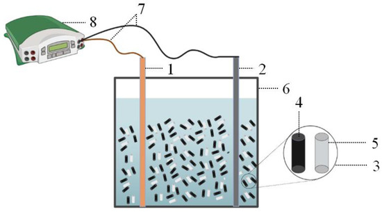 Schematic diagram of the experimental device (1—anode plate, 2—cathode plate, 3—particle electrode, 4—GAC, 5—MAC, 6—electrolyzer, 7—wire, 8—DC power supply).