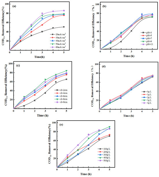 Effect of different single-factor condition changes on CODCr removal rate ((a) current density; (b) pH; (c) plate spacing; (d) concentration of NaCl; (e) particle filling amount).