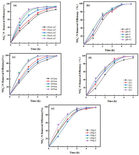 Effect of different single-factor condition changes on NH4+-N removal rate ((a) current density; (b) pH; (c) plate spacing; (d) concentration of NaCl; (e) particle filling amount).
