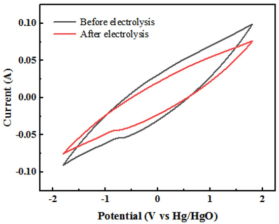 In order to determine whether direct electrochemical oxidation exists on the surface of the RuO2-IrO2/Ti anode plate, the cyclic voltammetry (CV) curves of RuO2-IrO2/Ti before and after electrolysis are tested using a three-electrode system with an electrochemical workstation (PARSTAT4000, Princeton Company, Princeton, NJ, USA), and the positions and shapes of the peaks in the CV curves are used to analyze whether redox reactions occur on the surface of the RuO2-IrO2/Ti anode plate. The ruthenium–iridium–titanium (RuO2-IrO2/Ti) electrode was used as the working electrode, the platinum electrode as the auxiliary electrode, and the mercuric oxide (Hg/HgO/OH-) electrode as the reference electrode. The electrolyte was ammonia wastewater + 1 g/L NaCl. The scanning speed is set at 0.1 V/s, and the cyclic voltammetry curves of the RuO2-IrO2/Ti electrode plate before and after the electrolysis of ammonia wastewater by the three-dimensional electrochemical oxidation system (3DEOS) are tested for a total of three laps, and the most stable lap is selected as the final curve.