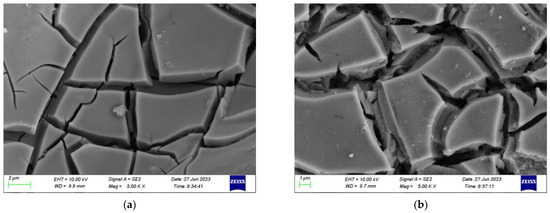 As shown in Figure 5, the surface of a RuO2-IrO2/Ti electrode plate shows a typical mud crack morphology uniformly [56] before electrolytic treatment of ammonia nitrogen wastewater, and there is still a certain amount of gap on the surface of a RuO2-IrO2/Ti electrode plate. The crack is caused by the difference in the thermal expansion coefficient between the metal oxide coating loaded on the electrode plate and the titanium plate. Some cracking occurred in the metal oxide coating during the process of high-temperature roasting and subsequent cooling. After the completion of the electrolytic treatment of ammonia nitrogen wastewater, the surface structure of the RuO2-IrO2/Ti electrode plate is almost unchanged compared with that before the electrolytic treatment of ammonia nitrogen wastewater, and the surface of the plate only slightly dissolves. This is because the oxide layer on the surface of the plate dissolves slightly under the action of the electric field. This phenomenon shows that the RuO2-IrO2/Ti electrode plate is not polluted in the process of electrolytic treatment of ammonia nitrogen wastewater, and the direct electrochemical oxidation process on the electrode plate surface is not the main oxidative degradation mechanism of the target pollutants in the electrolytic treatment of ammonia nitrogen wastewater with RuO2-IrO2/Ti electrode plates.