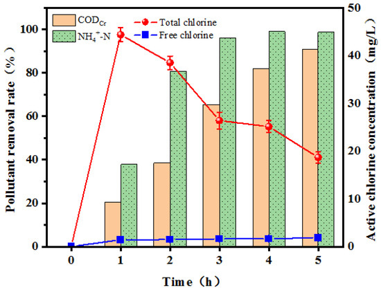 During the 5 h electrolysis period, the changes in CODCr and NH4+-N removal, total chlorine and free chlorine concentrations in the electrolysis system with electrolysis time are shown in Figure 6.