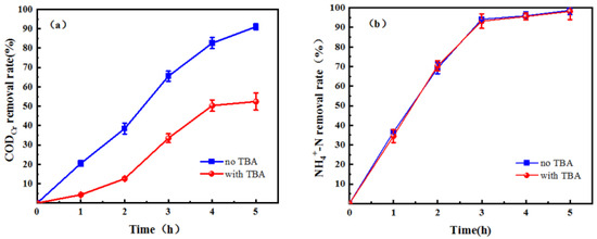 During the 5 h electrolysis period, the changes in CODCr and NH4+-N removal in the two electrolysis systems before and after TBA addition are shown in Figure 7.
