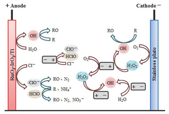 Through literature [58,59,60,61,62] studies, as well as the test analysis of the RuO2-IrO2/Ti anode plates and the experimental data described above, based on the basic principle of an electrochemical redox reaction, the migration and transformation of CODCr and NH4+-N in the reacting solution can be roughly understood as shown in Figure 8.