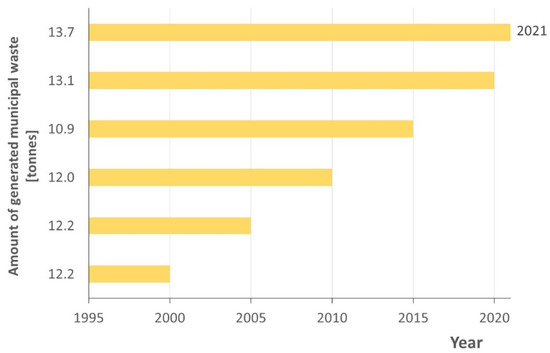 Poland is located in Central Europe and has 38.8 million inhabitants (in 2021). The country has been a member of the EU since 2004. In 2021, 121 million tons of waste were generated in Poland, of which 11.3% was municipal waste (13.7 million tons). Although the total amount of waste generated in Poland in the years 2000–2021 systematically slightly decreased (137.7 million tons in 2000 and 121.4 in 2021), the amount of municipal waste increased (Figure 1) [31].