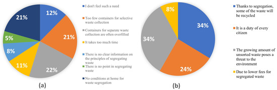 Of the 700 respondents, as many as 626 (89.6%) declared that they participated in the process of selective waste collection. When asked to explain the reasons for such an attitude, respondents who declared that they did not sort waste indicated a lack of publicly available containers for selective waste collection or their too small volume (which often causes them to overflow), as well as a lack of conditions for sorting waste at home (Figure 2a). At the same time, all respondents were asked whether they believed that waste sorting was important. As many as 98% of all respondents believe that sorting waste is important because it enables the processing and use of secondary raw materials into new materials (589 responses) and also reduces the emission of pollutants into the soil, air, and water (526 responses). Respondents who declared that they sorted waste when asked about their motivation most often indicated fear of the environmental threat posed by waste (34%) and the desire to contribute to the recycling of waste generated (34%) (Figure 2b).