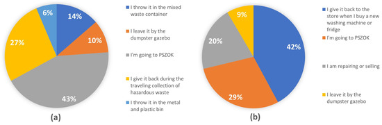 E-waste is a specific type of waste because, on the one hand, it contains valuable materials that can be recovered in recycling processes, and, on the other hand, it contains harmful substances and chemicals (mercury, lead, cadmium, etc.) [40]. In the survey, over 70% of respondents indicated that they return electronic waste such as broken washing machines or refrigerators to the store when shopping for new ones or to PSZOKs. However, 9% incorrectly leave them next to garbage sheds. It is interesting that 20% of respondents have them repaired or sell them (Figure 3b).