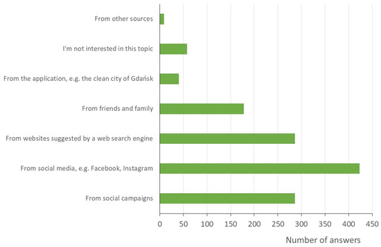 Due to the fact that, as Xiao et al. [41] point out, citizens who are better informed are more likely to participate in the waste sorting system than those who are not so well informed, in our research, respondents were also asked where they obtain information about the correct methods of separating waste. Analyzing the results, it should be stated that the main sources of information on waste sorting are social media sites such as Instagram or Facebook (33%) and websites (22%) (Figure 4). In recent years, many educational accounts have been created on these platforms, presenting knowledge in the field of environmental protection in a very accessible way for Internet users, such as the Facebook group ‘Zero Waste Polska’ or the waste-related account ‘The Waste Lady’ on Instagram.