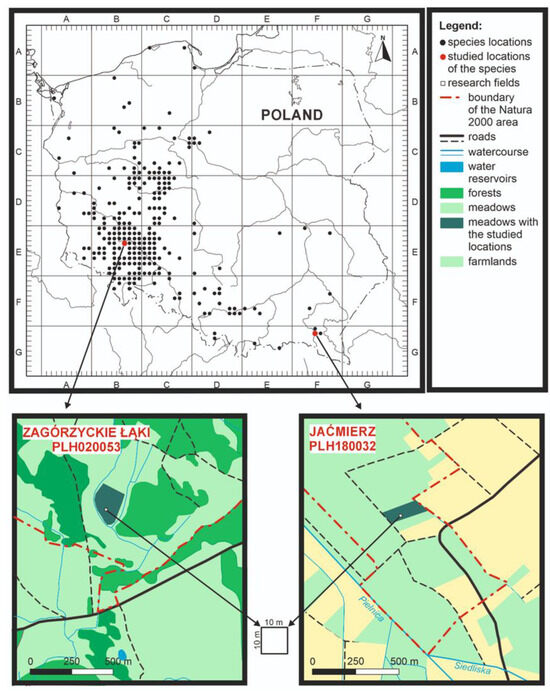 Site 2 is situated by the town of Zagórzyce in the south-western part of the country, in the mesoregion of the Rościsławice Heights in the Silesian Lowland [78]. The studied area lies in low terrain, at an elevation of 107 m above sea level. It is dominated by brown acidic soils and alluvial soils, where the average annual precipitation reaches 600 mm, and the average annual temperature is 8.5 °C [81]. In this terrain is found the Natura 2000 area “Zagórzyckie Meadows PLH020053”, which protects the natural habitat 6410 (Molinion caeruleae). Part of the patches of Molinion caeruleae meadows occurring here are used extensively and part undergo secondary succession [82]. A surface area of 2.5 ha was studied, which is mowed in a two-year system, allowing protection of the community and rare species occurring there. Site 2 lies within the area of the dense western occurrence of the species.