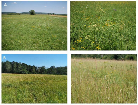 A view of plant communities with Silaum silaus individuals at study sites: (A) Site 1—Jaćmierz; (B) Site 2—Zagórzyce (photos: (A) T. Wójcik; (B) A. Stadnicka-Futoma).