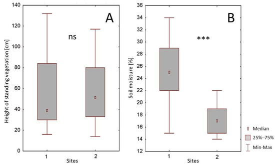 The median (±Min–Max) of soil moisture (A) and height of herbaceous vegetation (B) from 2 research sites in the year 2020. The asterisks show the statistical significance of differences at the level <0.001 (***); ns—not significant.