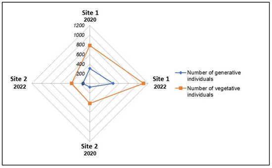 The largest population of Silaum silaus was noted at site 1, where 314 generative specimens and 786 vegetative specimens were identified in 2020, as well as 480 generative specimens and 1105 vegetative specimens in 2022 (Figure 4). At site 2, 74 generative specimens and 410 vegetative specimens were noted in 2020 and 145 generative and 375 vegetative specimens in 2022.