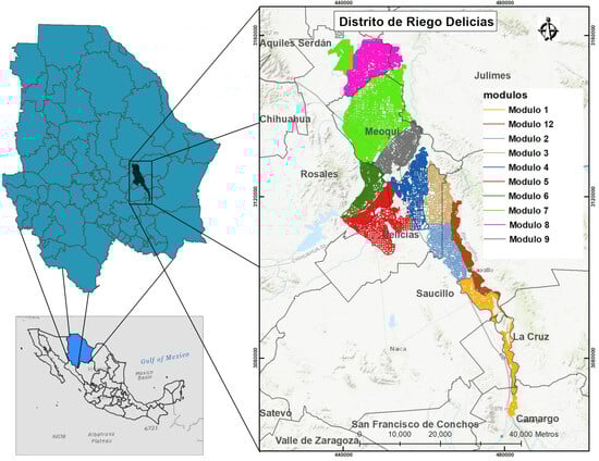 The Irrigation District 05—Delicias, Chihuahua, Mexico, belongs to the Rio Bravo hydrological basin. It is located in northern Mexico, in the south central region of the State of Chihuahua, 28°11″ north latitude and 105°28″ west longitude, with an average altitude of 1165 m above sea level. The DR-05 has an area of 100,093 ha, where 80% of the area is irrigated and 20% uses seasonal precipitation. This area has 8113 producers that grow crops. These producers are organized into 10 non-profit organizations called “modulo” (Figure 1), whose main function and responsibility is the distribution and delivery of watering volume to its users. These modules are, in turn, integrated into two limited liability companies, whose functions are water delivery to the irrigation modules and giving maintenance to distribution major infrastructure in the DR-05.