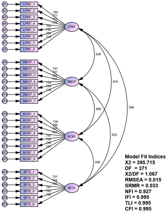 The synergetic integration of lean practice key factors, sustainable management construction practices and alliance contract key factors was analysed using the SEM approach and is shown in Figure 2. It was found that H1, the lean practice key factors, have significant effect on the benefits of synergetic integration, with a 0.238 β value. This suggests that implementing lean practices contributes positively to the overall integration benefits, enhancing efficiency, reducing waste, and improving project outcomes. H2, the sustainable management construction factors, have significant effect on the benefits of synergetic integration, with a 0.339 β value. This underscores the critical role of sustainability in enhancing the integration benefits, highlighting its importance in reducing environmental impact, promoting resource efficiency, and contributing to the long-term viability of construction projects. H3, the alliance contract key factors, have significant effect on the benefits of synergetic integration, with a 0.270 β value. This finding suggests that alliance contracts, which emphasize collaboration, shared risks, and rewards among project stakeholders, are crucial for maximizing the benefits of integration, leading to better risk management, dispute resolution, and project success rates. Table 4 depicts the hypothesis testing results. In addition, to check the reliability, several factors were calculated, including Cronbach’s Alpha (Alpha), Composite Reliability (CR) and Average Variance Extract (AVE). Table 5 displays the reliability analysis using measures like Cronbach’s Alpha, Composite Reliability (CR), and Average Variance Extract (AVE) for each construct: the constructs show high reliability (α > 0.7, CR > 0.7) and acceptable convergent validity (AVE > 0.5).The results of the model fit observed was depicted in Figure 3, and signify how well the model aligns with the observed data. The SEM analysis provides empirical evidence supporting the positive impact of lean practices, sustainable management construction practices, and alliance contract key factors on the benefits of synergetic integration in construction projects. The high reliability and validity of the variables, along with a satisfactory model fit, affirm the strength and significance of the findings. This analysis highlights the importance of integrating these practices to achieve enhanced project outcomes, sustainability, and efficiency in construction management.