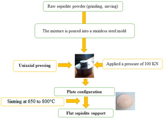 Flat sepiolite membranes were prepared using the uniaxial pressing technique, as described in Figure 1. The sepiolite powder (<100 µm) was homogeneously mixed with a few drops of water and then uniformly dispersed in a stainless steel mold to press under a pressure of 100 KN for 6 min. By applying such high pressure, the sepiolite particles are compacted and tightly packed to form a dense and uniform disk. The membranes were then sintered in a programmed oven at various temperatures with a plateau at 300 °C for 2 h to remove impurities. The final heating temperature according to the program of temperature increase was between 650 °C and 800 °C. A low heating rate of 2 °C/min was chosen to avoid cracking formation in the ceramic membrane.