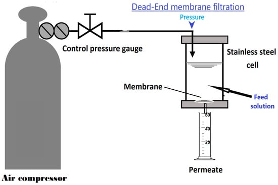 Filtration tests were performed using a laboratory dead-end filtration system, as shown in Figure 2. The flat membrane, with a filtration area of 19.6210−4 m2, was initially immersed for 24 h in distilled water before being placed in the membrane module. Membrane filtration was performed in a pressured system using compressed air at room temperature.