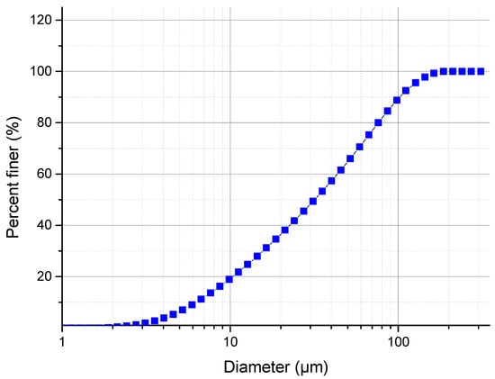 The laser granulometry test of sepiolite particles, obtained after grinding and sieving through a sieve of 100 μm, provides information about the size distribution and relative abundance of different particle sizes. As shown in Figure 3, the majority of the sepiolite particles (>89%) were smaller than 100 µm. The presence of a small percentage greater than or equal to 100 µm can be explained by the shape and the irregularities of the sepiolite particles. Also, sepiolite particles may tend to form clusters or agglomerates due to their physical and surface properties, leading to the presence of some particles larger than 100 µm. In addition, the sepiolite particles exhibited a wide range of particle sizes. The majority (73%) of sepiolite particles have diameters within the range of 2–63 µm. This suggests that the sepiolite sample consists of a significant proportion of particles in the fine to medium size range.