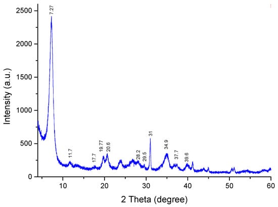 XRD analysis is a fast analytical technique mainly used to obtain information about the crystalline components present in raw sepiolite. As shown in Figure 4, the strong and intense peak was centered at 2θ of 7.2°, which is comparable to the JCPDS card (70-1597) for the sepiolites [39]. This peak presents the main sepiolite characteristic reflection of the layer spacing d110 = 12 Å [39,40]. Other characteristic reflections of sepiolite occurring at 2θ of 11.7°, 17.7°, 19.7°, 20.6°, 28.2°, 34.9°, and 39.6° were present. Notably, 2θ of 20.7° corresponds to quartz characteristics, while 2θ of 29.5° is attributed to carbonate impurities. Based on the aforementioned results, XRD analysis showed the same structural characteristics as the previous literature [39,40].