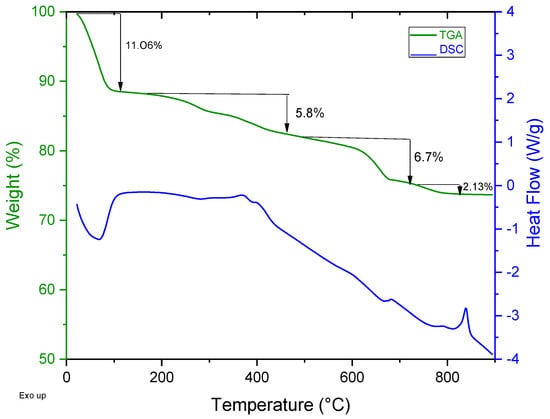 TGA and DSC analyses were performed using a single instrument to characterize the thermal properties and behavior of the material. Figure 5 shows the coupled TGA and DSC analyses of the raw sepiolite. The weight changes of the sample when the temperature increased show that about 11% of weight loss occurred between 22 °C and 130 °C due to evaporation or loss of water in the sample. The temperature of weight loss corresponds to the water boiling point at a standard atmospheric pressure of about 100 °C. Consequently, the weight loss of 11% indicates that the sample contains a significant amount of water, which is associated with the endothermic peak at 68 °C [33]. A mass loss of 5.8% in the temperature range of 150 °C and 461 °C, combined with an endothermic peak at 281 °C, corresponds with the release of the bound water from the sepiolite [33,41]. The mass losses of 6.7% and 2.13% associated with the decomposition of the carbonate impurities and the dehydroxylation process occurred in the temperature ranges 500–685 °C and 690–900 °C, respectively. Also, the thermal treatment in the range of 500–685 °C can be attributed to the dehydration of the strongly bound water from sepiolite clay. In a previous study, the temperature range of 730–860 °C indicated the loss of structural water, which lead to little change in the sepiolite structure [42]. The exothermic peak at 850 °C indicates the transformation of sepiolite into orthoenstatite (MgSiO3) [33,41]. This phenomenon was the result of bound water losses, which were in coordination with terminal Mg2+; consequently, the terminal Mg2+ in the octahedral layer was coordinated with the silica layer. In a similar vein, Zhang et al. [43] focused on phase transformation and morphological evolution by investigating the effects of thermal treatment on sepiolite fibers. They observed that significant crystal transformations occurred in the sepiolite at temperatures above 810 °C, which indicates that the thermal treatment allows a change in the crystal structure of the sepiolite.