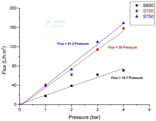 Water permeability, LP (L/h·m2·bar), is an important factor in determining the optimal operating conditions for the membrane. To evaluate permeability, a test was conducted using distilled water at a pressure range of 1–4 bar. As shown in Figure 6, the evolution of the water permeability with pressure follows Darcy’s law, and the water permeabilities for the S650, S700, and S750 membranes were 18, 39, and 41 L/h·m2·bar, respectively. This behavior was consistent with previous studies, as reported in the literature [44,45]. The increase in permeability Lp with increasing sintering temperatures is likely attributable to the corresponding enlargement of the pore sizes, strengthening the influence of pore size on membrane permeability characteristics [45].