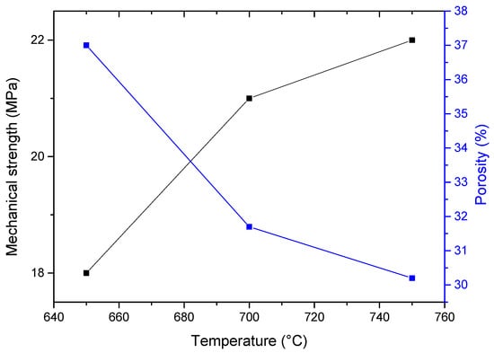 Contrary to the mechanical strength, as shown in Figure 7, the porosity decreased with an increasing in sintering temperature. This result is consistent with the trends found in the literature [38,44], indicating that an increase in the sintering temperature promotes particle fusion and compaction, thereby reducing the overall porosity of the sepiolite membrane. This densification leads to a decrease in the volume of void spaces within the material, resulting in a more compact and homogeneous structure which reduces the porosity.