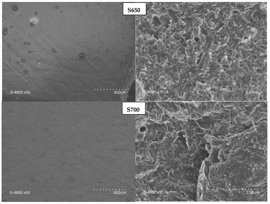 SEM micrographs of S650 and S700 membranes (3 magnifications: 600 µm, 2 µm, and 200 nm).
