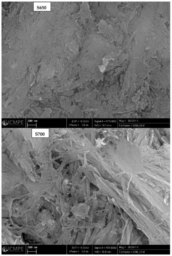 The SEM results for the S650 and S700 membranes at different magnifications (600 µm, 2 µm and 200 nm) provide useful information about their microstructure characteristics, as shown in Figure 8. It is clear that the microstructure was strongly affected by the sintering temperature [25,48]. At a magnification of 600 µm, the S650 and S700 membranes exhibited homogeneous surfaces without any macrodefects. At a magnification of 2 µm, SEM images revealed more complex details of the membrane structure. A notable observation was the reduction in the volume of porosity, indicating a reduction in the total volume of the empty space within the membrane. However, the pore size increased, indicating larger openings and channels within the membrane structures. These results suggest that high sintering temperature treatment at 700 °C produced dense membranes with larger pores than at 650 °C and consequently increased membrane permeability (Table 2). Similar findings have been reported in the literature regarding the use of several types of clay for the production of inorganic membranes, demonstrating a correlation between sintering temperature and membrane characteristics, such as a reduction in the porosity volume and an increase in the pore size [25,44,49]. From a higher magnification of 200 nm, it is very clear that the structure of sepiolite membranes involved disordered fibrous layers. The pore sizes of the S650 and S700 membranes, estimated from the SEM results, were around 40 nm and 150 nm, respectively. Therefore, these two membranes work in the domain of ultrafiltration.