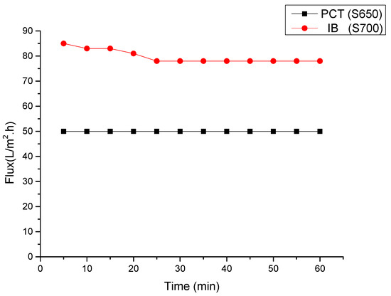 Permeate flux versus time during ultrafiltration of PCT and IB solutions by S650 and S700 membranes, respectively (T = 25 °C; TMP = 3 bar; pH of PCT solution = 7.5; pH of IB solution = 11).