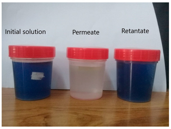 In general, NF is the most effective process for removing dyes and pharmaceuticals [19,20]. However, due to its small pore size, high pressure is required, which increases the operating cost [21,22]. Ultrafiltration represents a cheaper process; however, by operating with conventional UF membranes, dye and pharmaceutical substances could not be eliminated effectively due to the larger membrane pore diameter in comparison to the size of these substances.