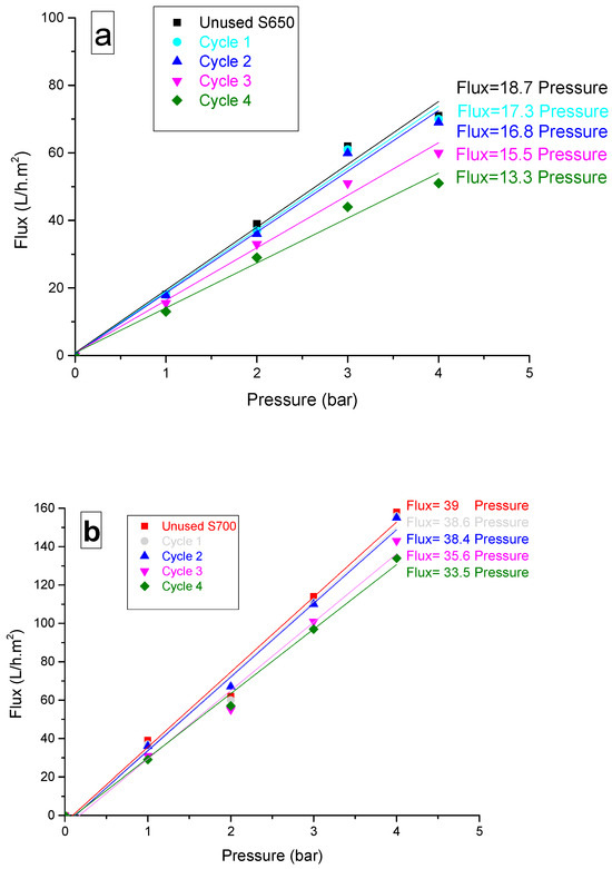 Membrane regeneration results after four rinsing cycles for (a) S650 and (b) S700.